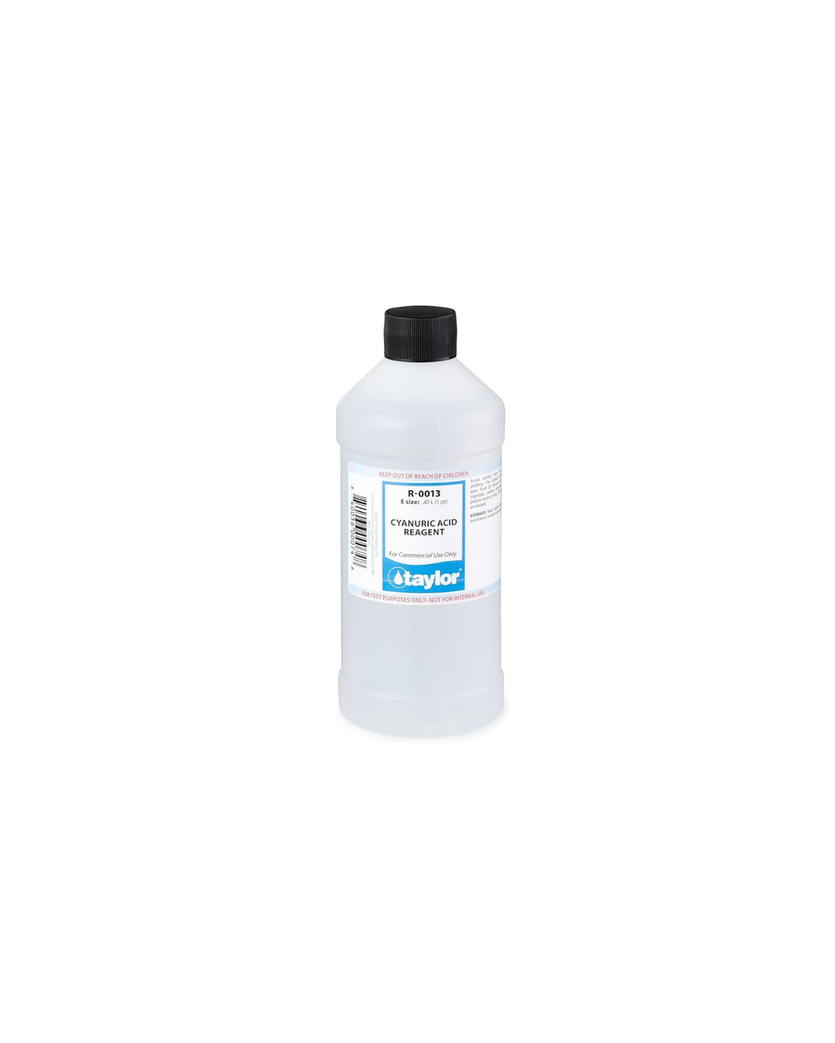 The reagent reacts with a water sample, causing a cloudy or colored change that can be measured (often by turbidimetric or “disappearing dot” methods) to find the CYA concentration.