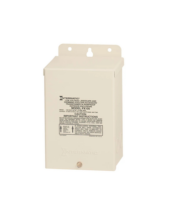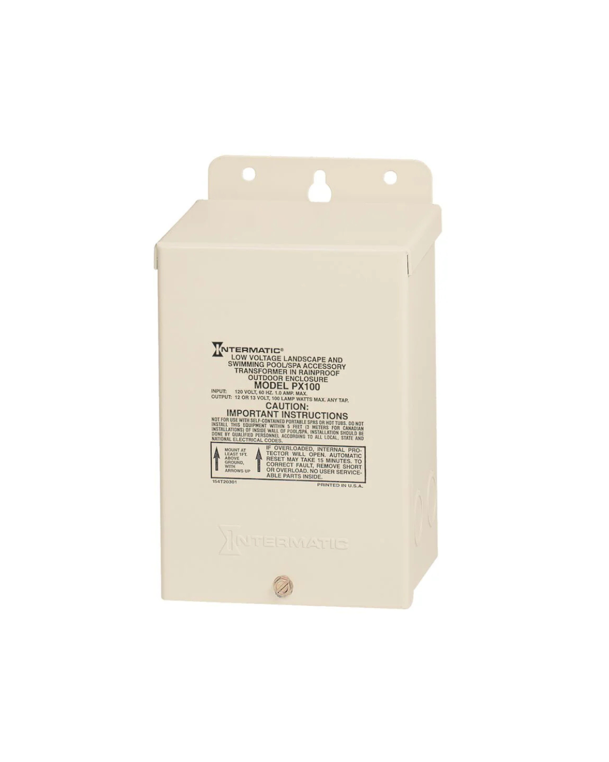 The Intermatic PX Series Safety Transformers are built to safely deliver low-voltage power to pool and spa lights. Available in 100-watt and 300-watt models, these transformers convert 120-volt input to a stable 12–14 VAC output while meeting NEC requirements for underwater luminaires. With grounded shields, built-in circuit protection, and durable steel enclosures, PX transformers provide long-lasting reliability in demanding outdoor environments. Whether you need a single light setup or multiple fixtures, the PX Series delivers the safety and performance pool owners and professionals can trust.